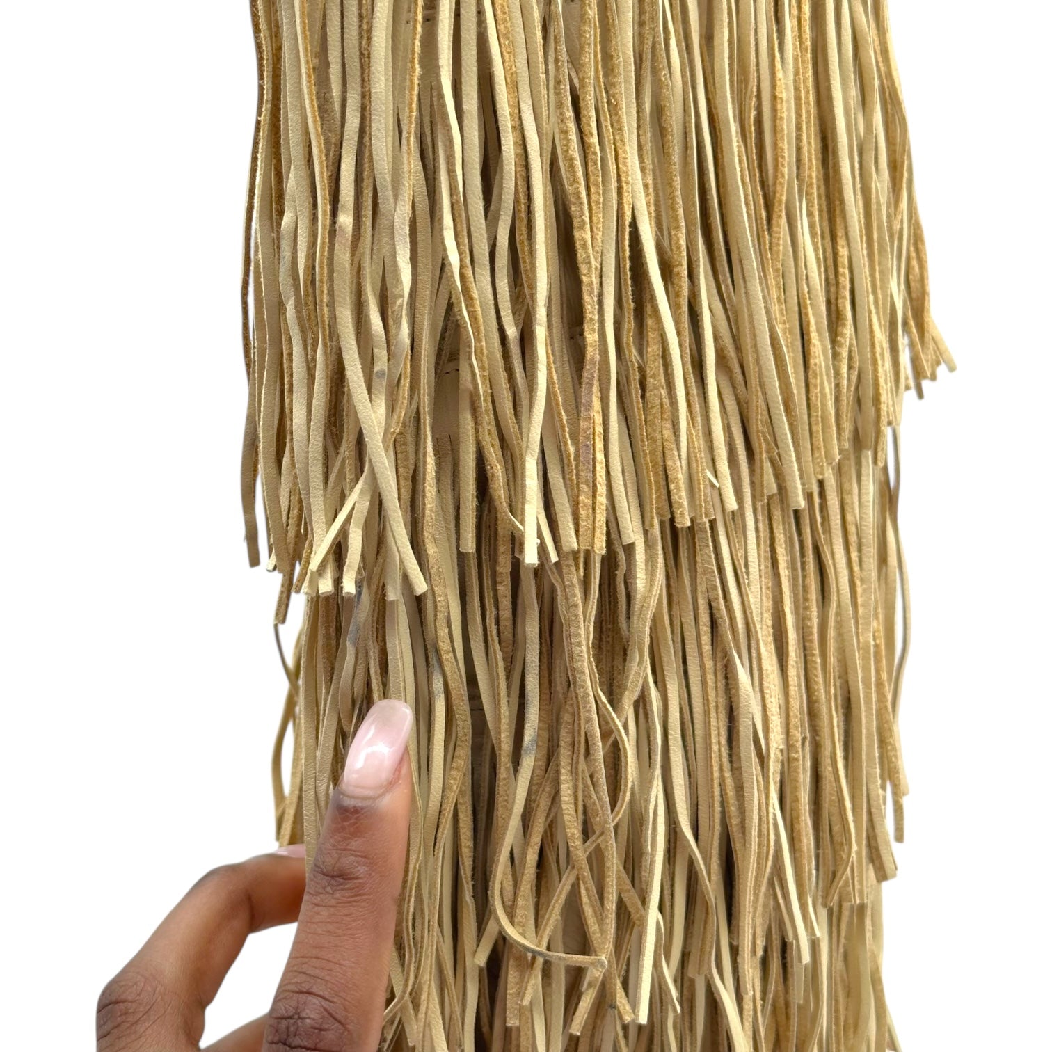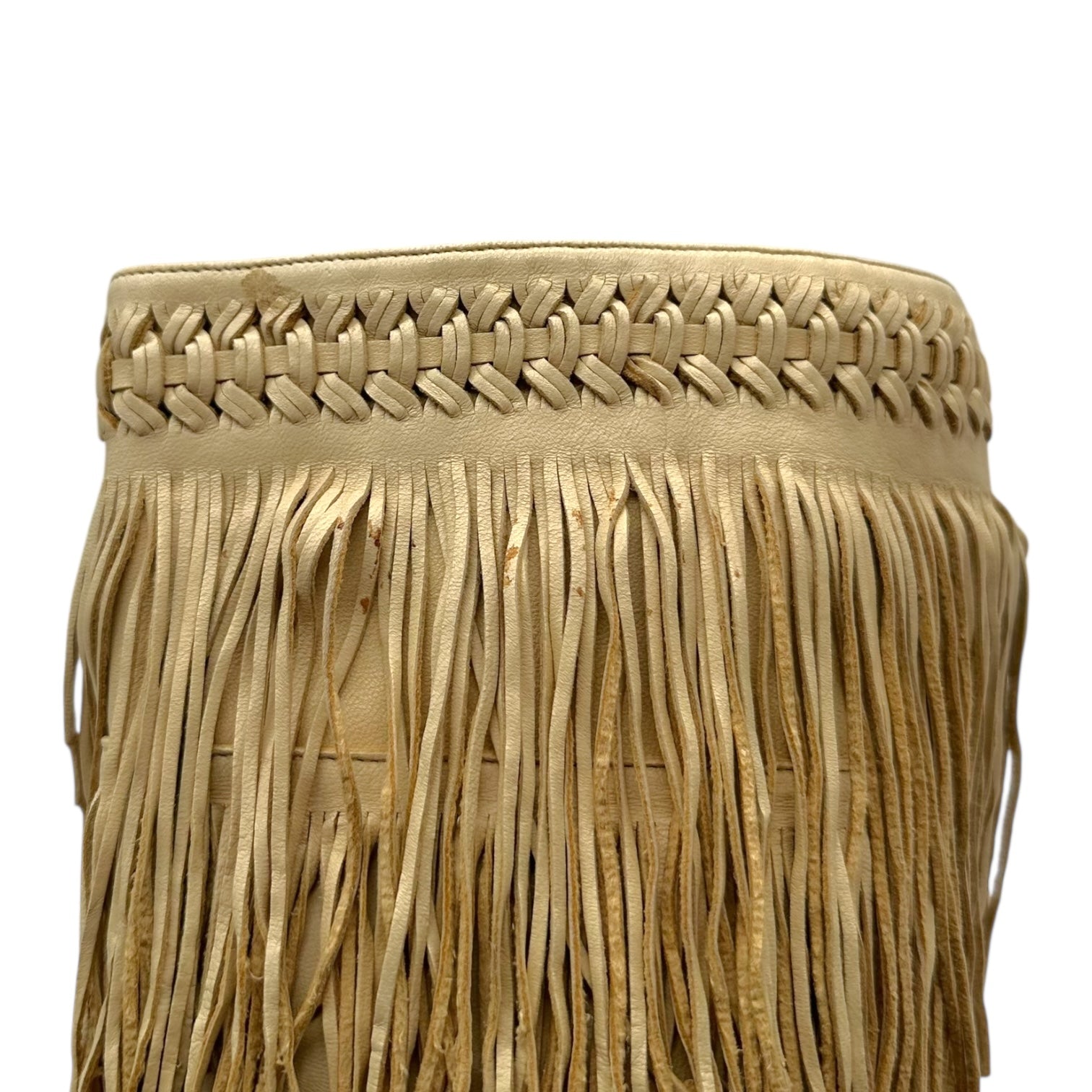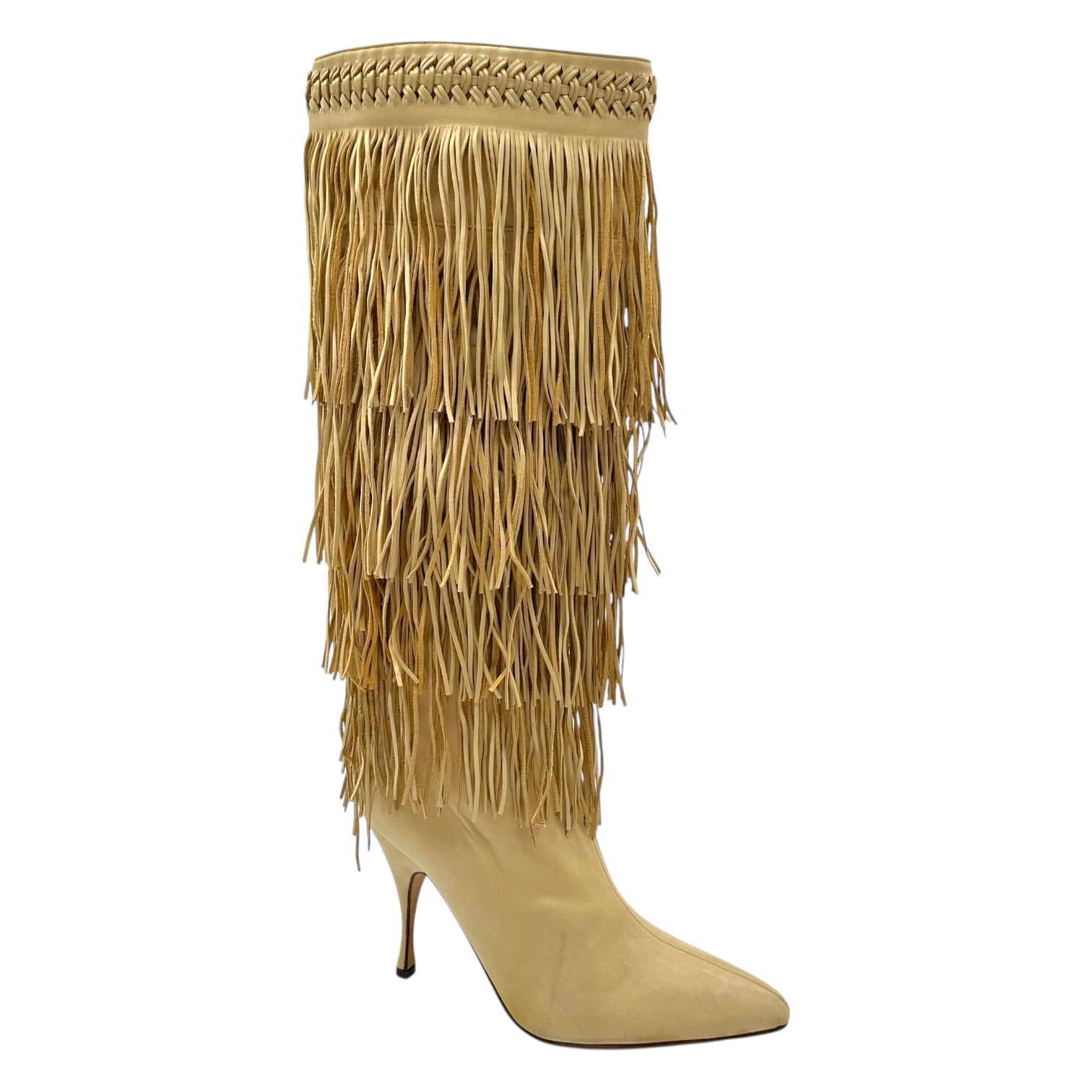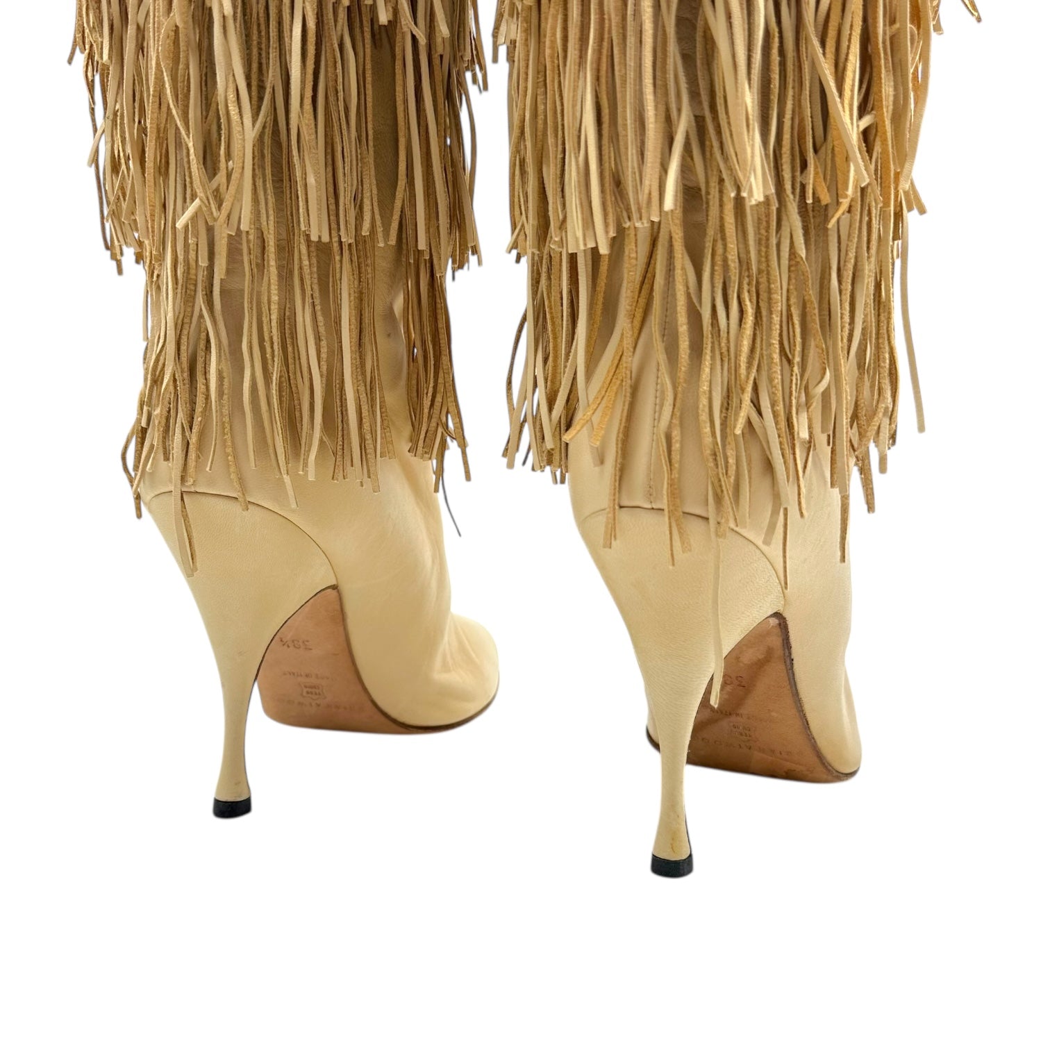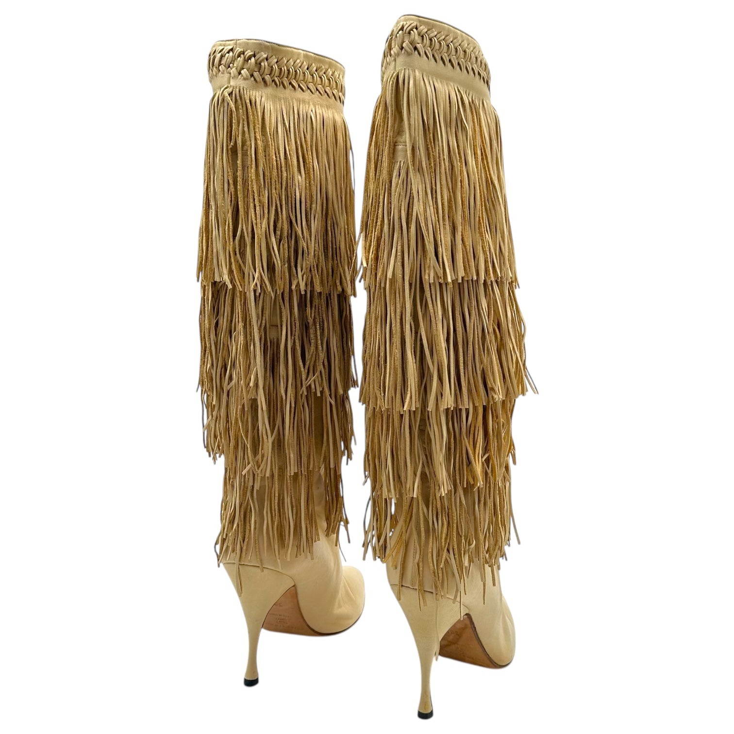 Brian Atwood Beige Leather Fringe Trim Heeled Boots