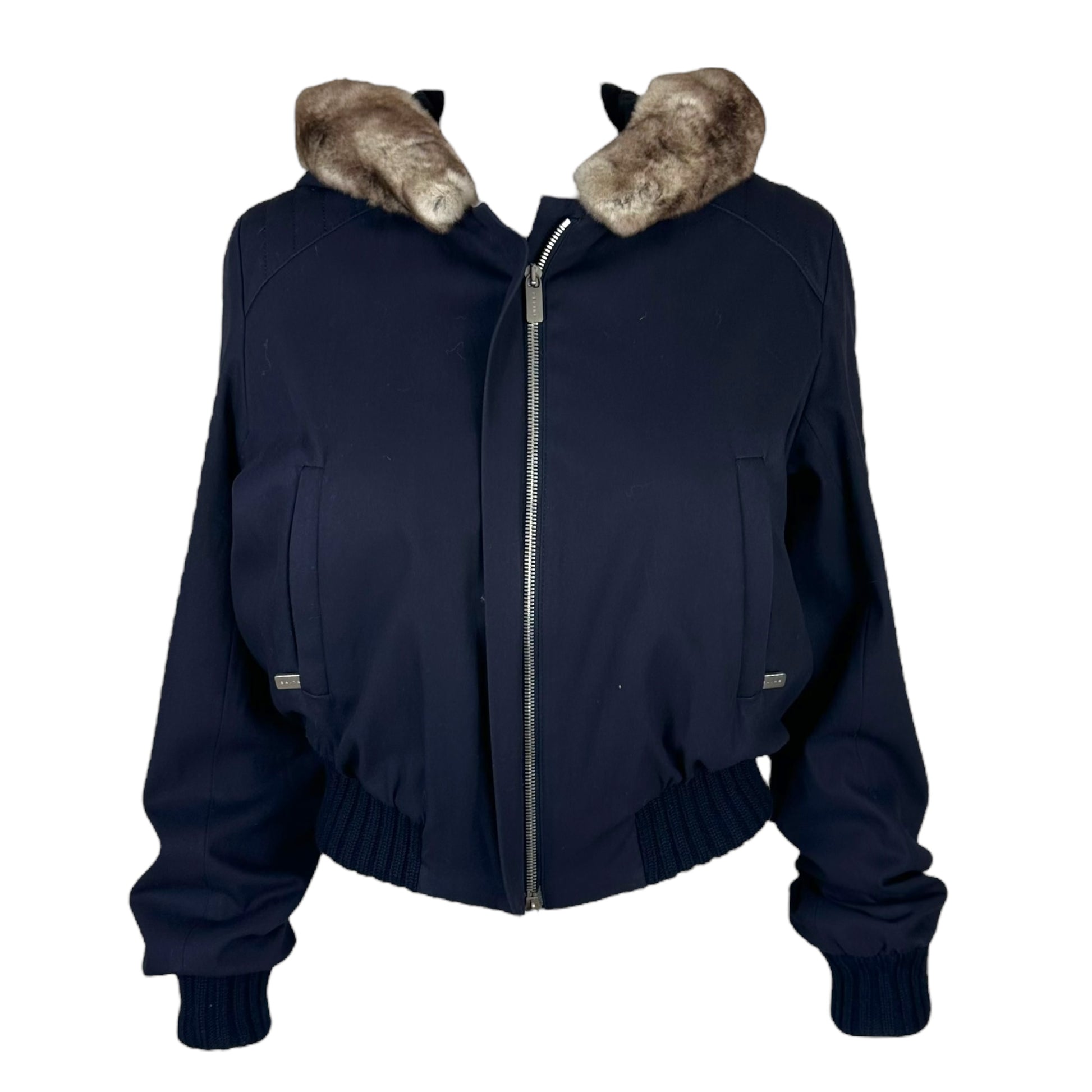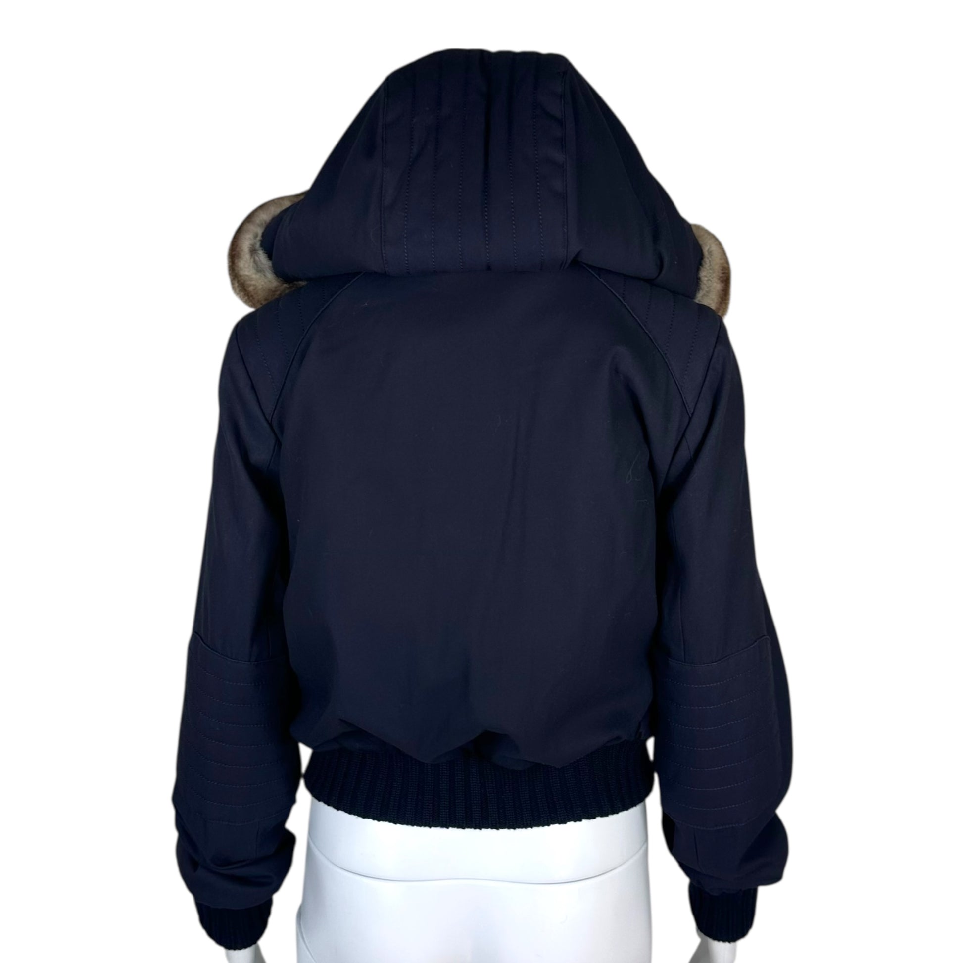 Celine Rabbit Fur Trim Hooded Navy Blue Bomber Jacket