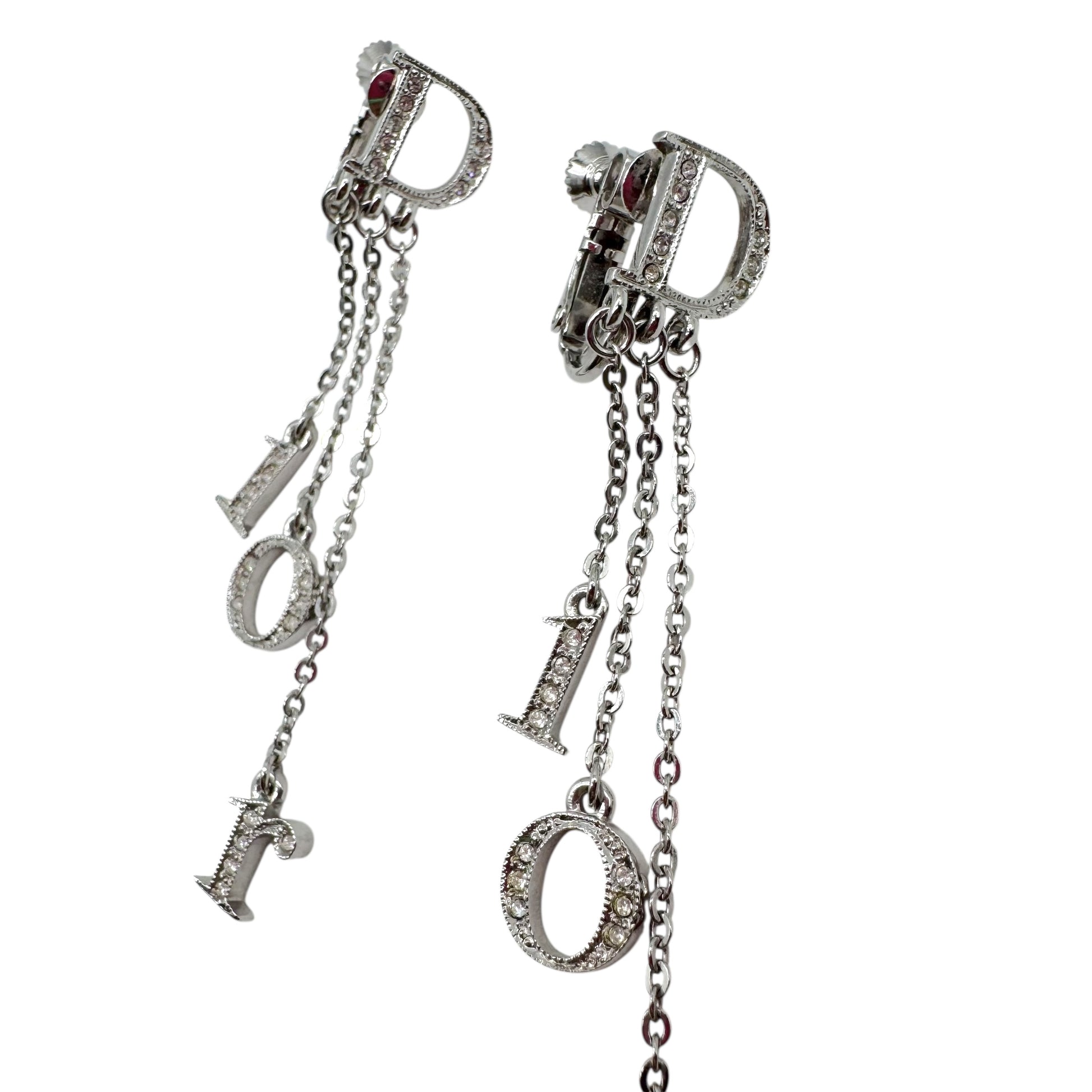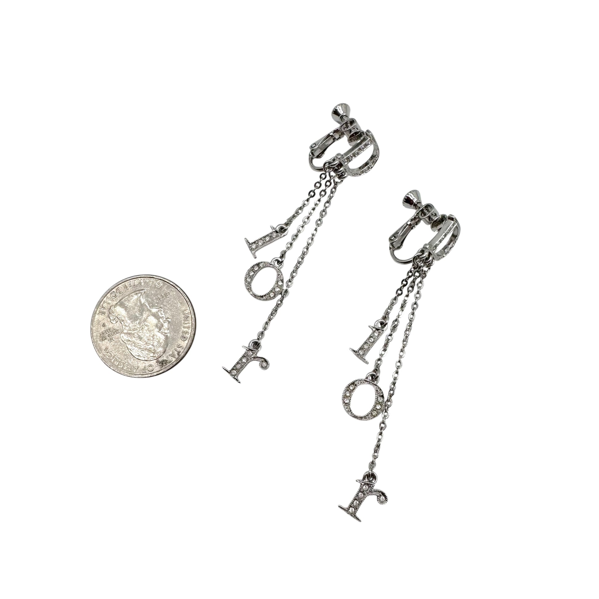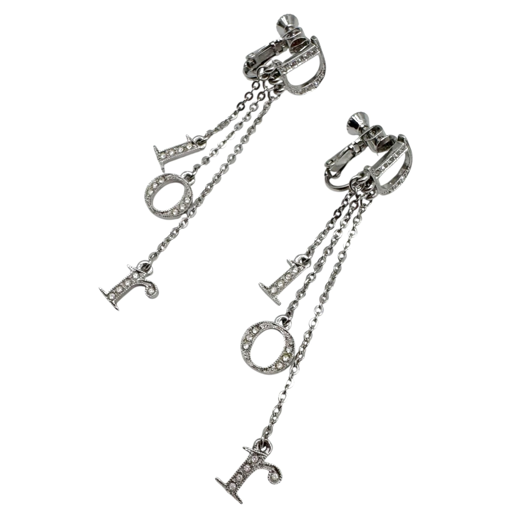 Christian Dior Silver Crystal Dangly Spell-Out Logo Clip-On Earrings