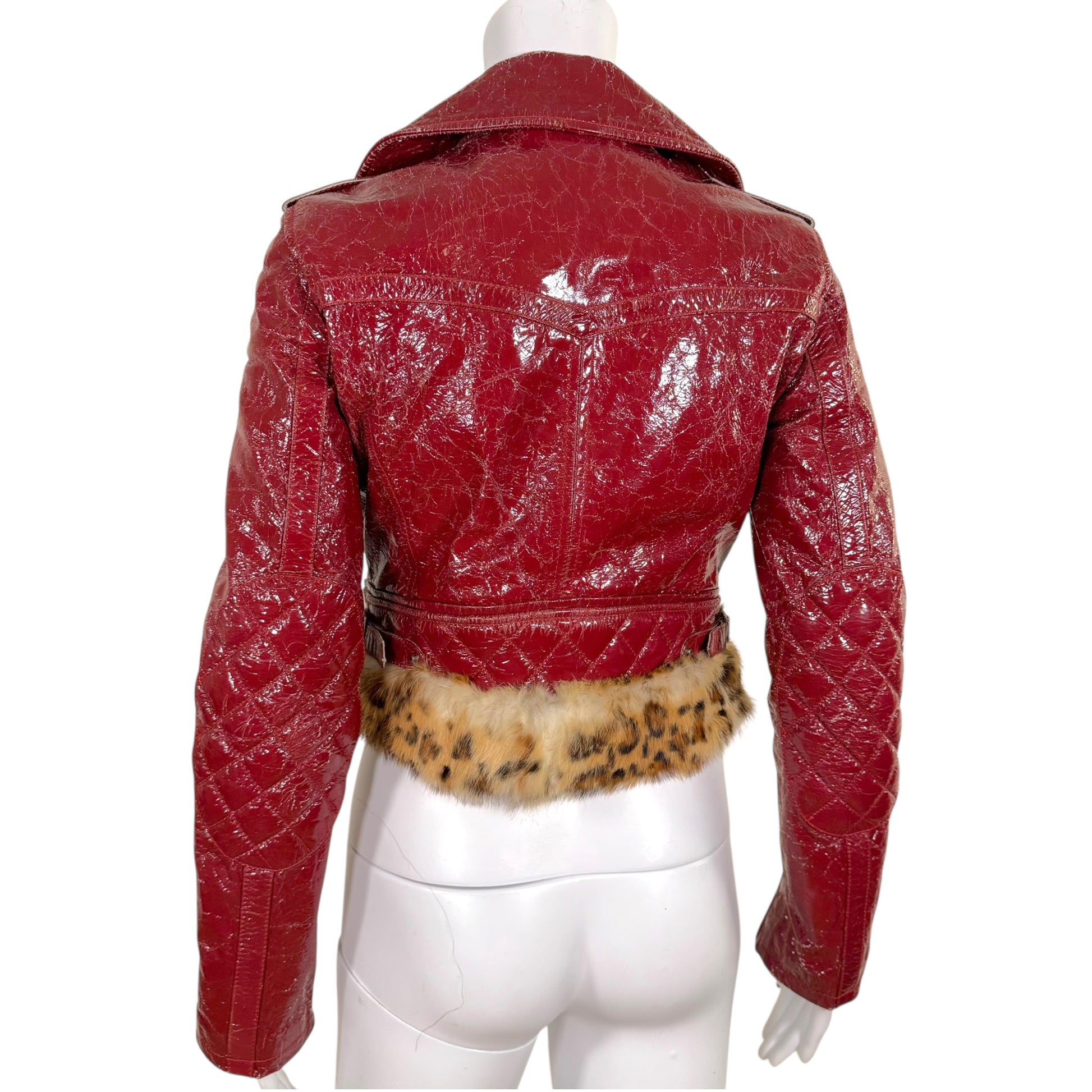 D&G Dolce & Gabbana Red Distressed Patent Leopard Rabbit Fur Lined Crop Moto Jacket