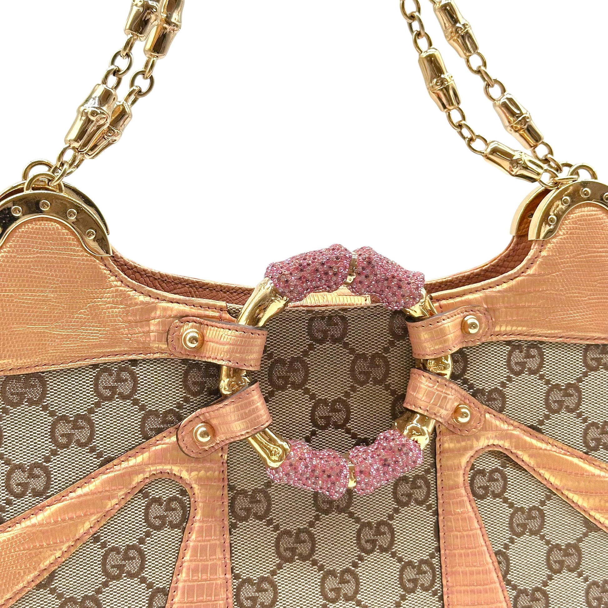 Gucci by Tom Ford S/S 2004 Tan Monogram & Pink Lizard Skin Crystal Bamboo Shoulder Bag
