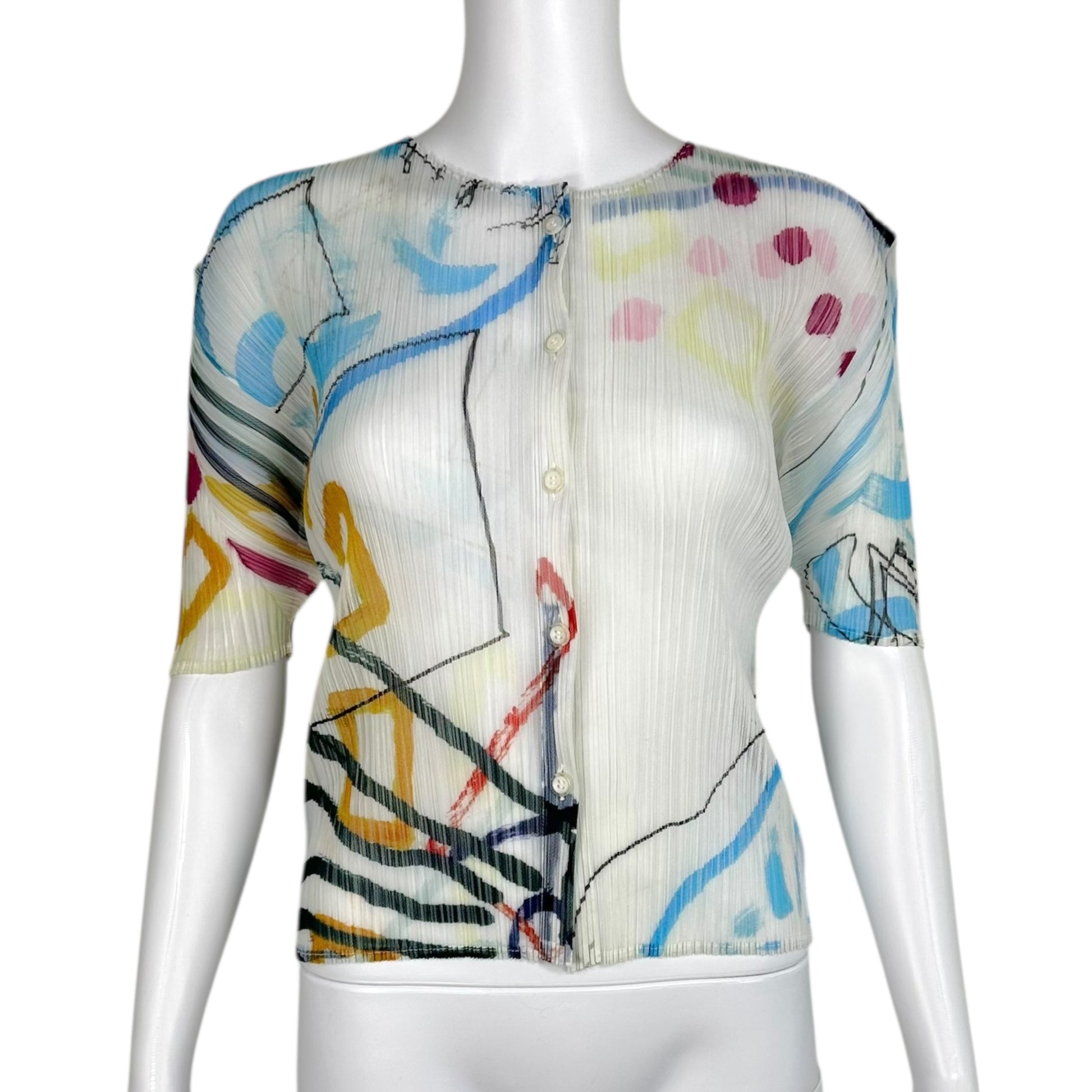Issey Miyake Pleats Please Multicolor Printed Pleated Mesh Short Sleeve Cardigan