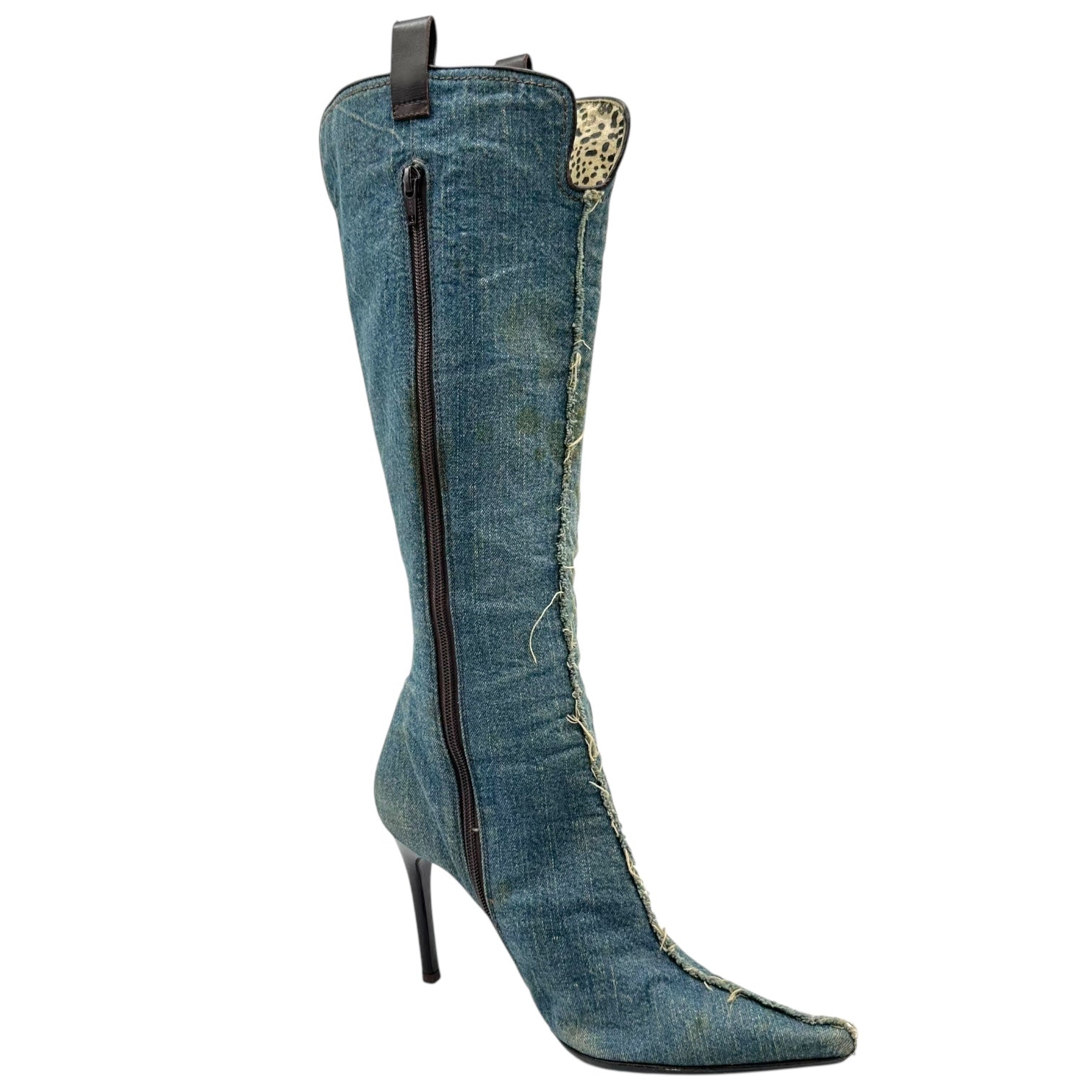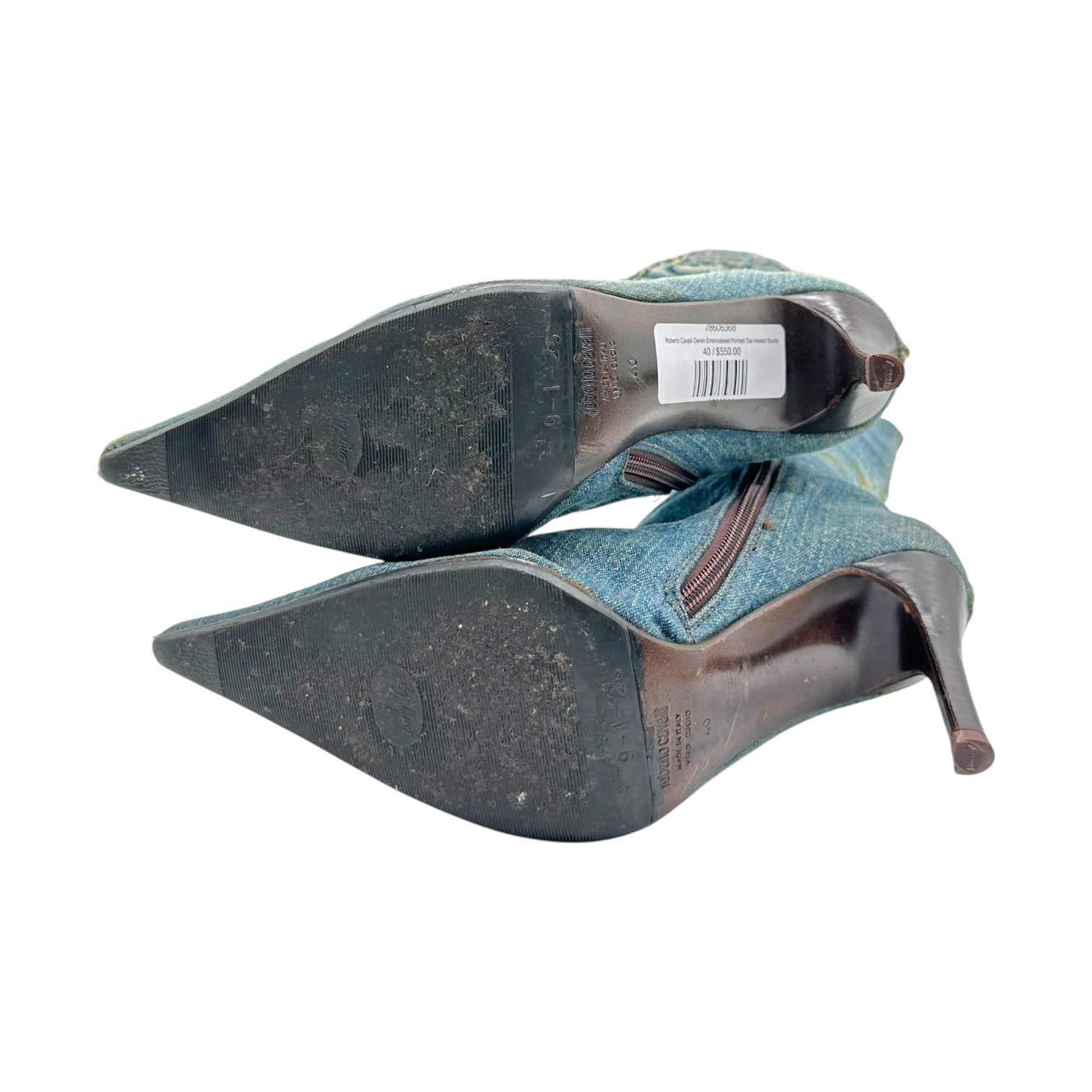 Roberto Cavalli Denim Embroidered Pointed Toe Heeled Boots
