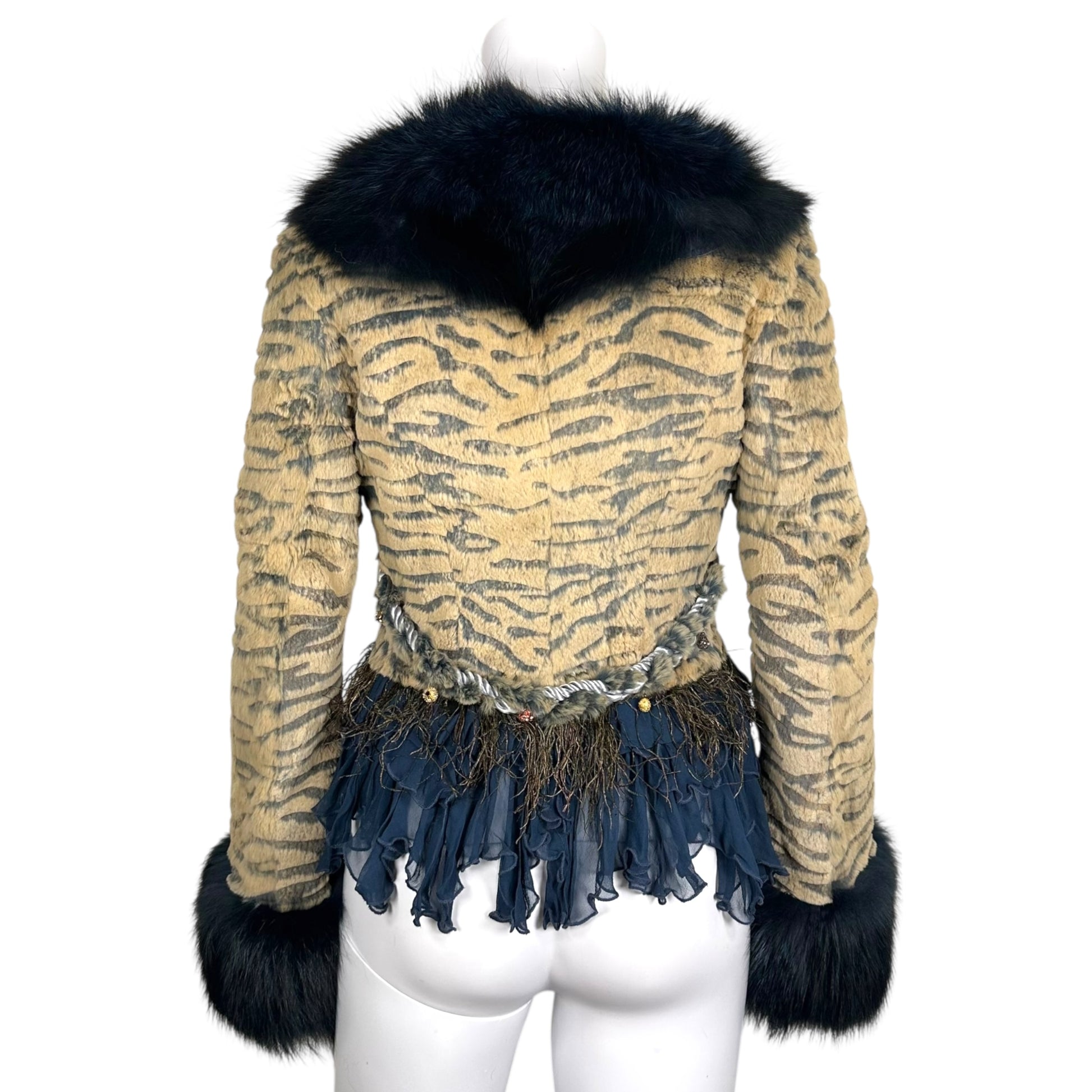 Vintage Blue Fox Fur & Silk Ruffle Trim Tiger Print Jacket