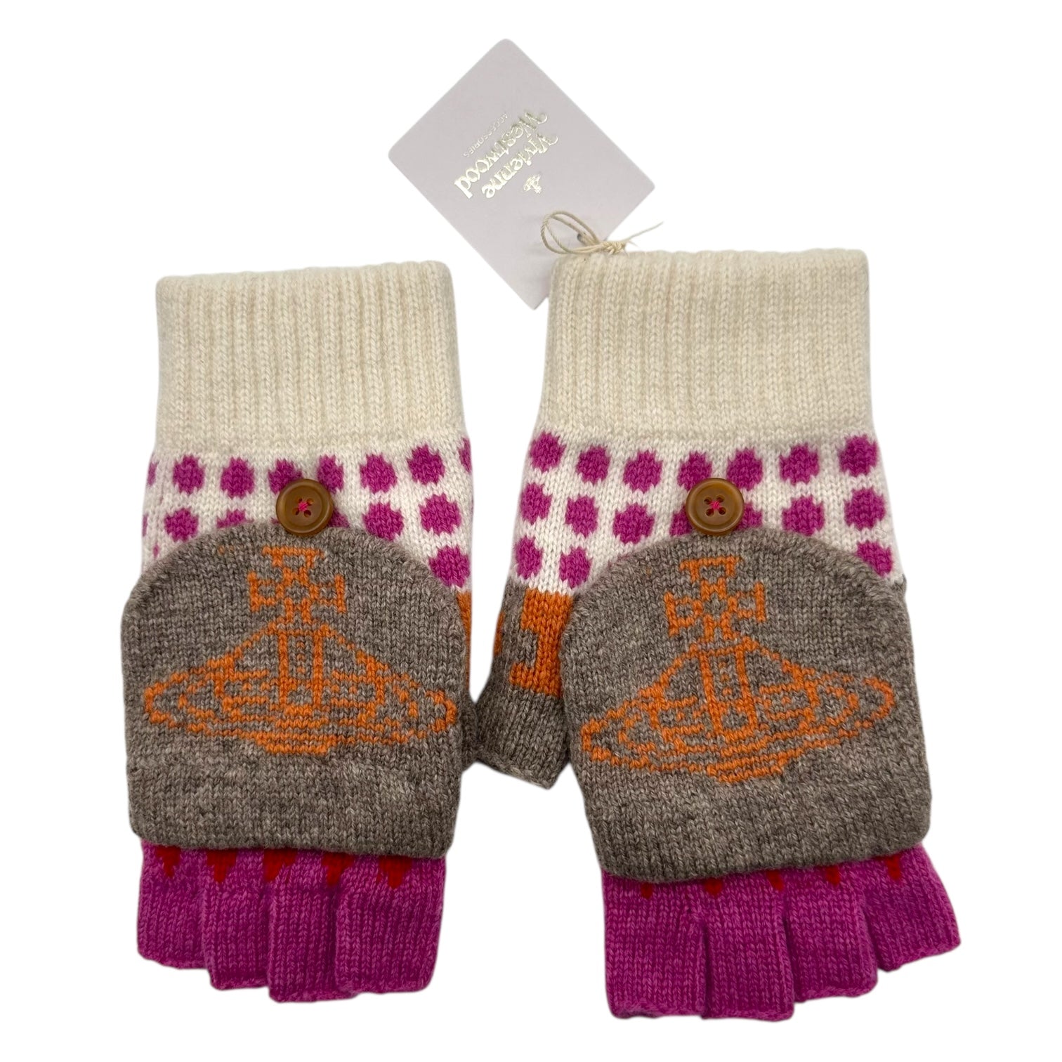 Vivienne Westwood White Pink & Gray Wool Logo Knit Mittens NEW